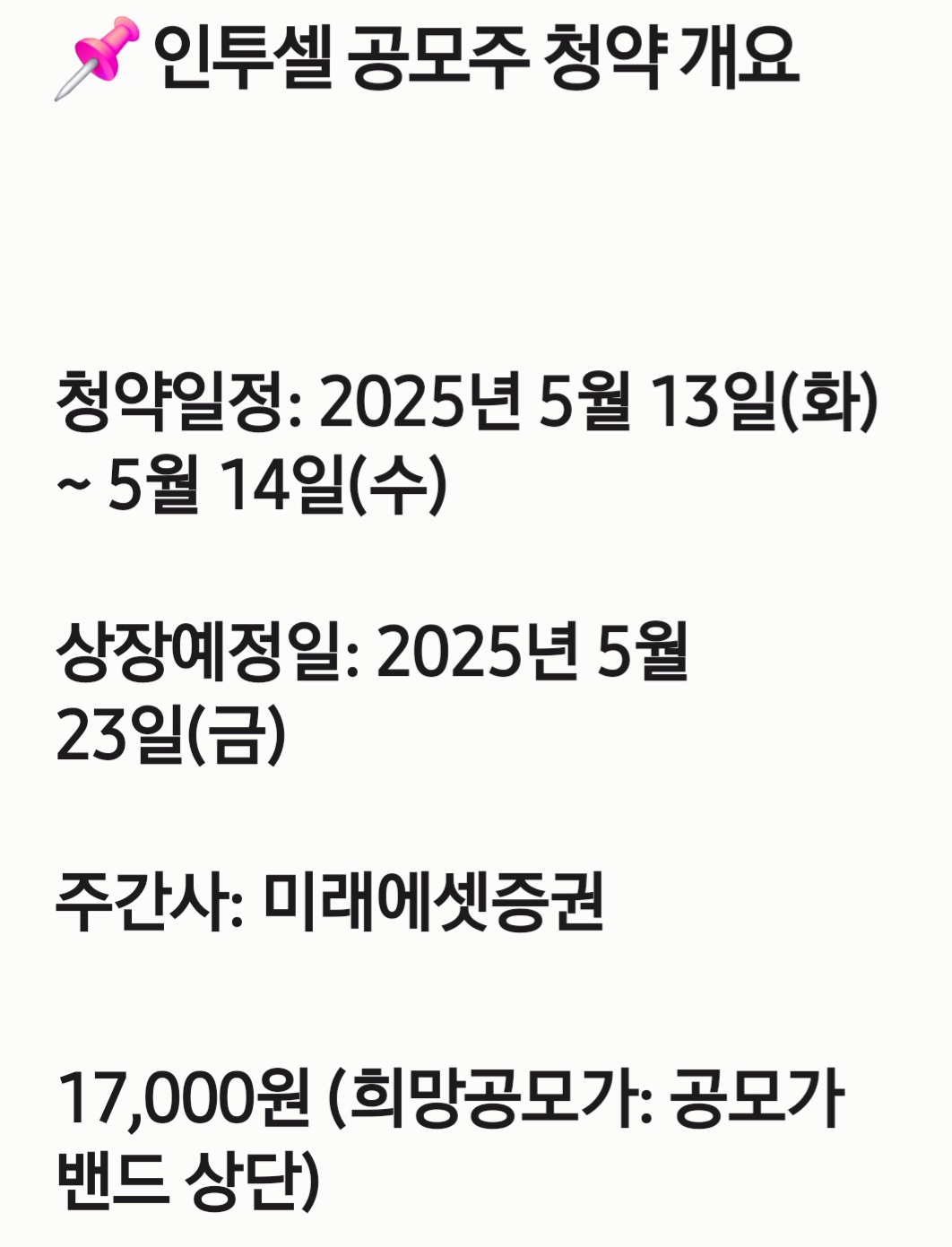 5월 셋째 주, 바이오 벤처기업 인투셀이 코스닥 상장을 앞두고 일반 청약을 진행합니다. 항체-약물 접합체(ADC) 플랫폼 기술을 보유한 인투셀은 기술특례 상장을 추진 중이며, 그에 따른 투자자들의 관심이 집중되고 있습니다. 📌 인투셀 공모주 청약 개요청약일정: 2025년 5월 13일(화) ~ 5월 14일(수)상장예정일: 2025년 5월 23일(금)주간사: 미래에셋증권 17,000원 (희망공모가: 공모가 밴드 상단)공모주식수: 1,500,000주 (100% 신주모집)청약증거금율: 50%배정비율: 우리사주조합 10%, 기관투자자 최대 65%, 일반청약자 최대 30% 💡 기업 개요 및 기술력인투셀은 2012년 설립된 바이오 벤처기업으로, 항체-약물 접합체(ADC) 기술을 기반으로 한 신약 플랫폼을 개발하..